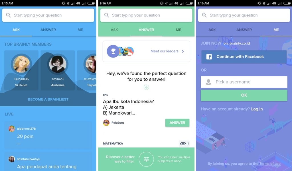 Platform ini cukup eksis di Indonesia. Menurut Brainly, pada 2015 di Indonesia ada 1,4 juta pengguna. Di dunia ada 100 juta. Brainly dapat digunakan di Android, iOS, dan peramban web. Menyediakan tiga tingkat pendidikan, yaitu SD, SMP dan SMA. Juga terdapat 25 kategori mata pelajaran.