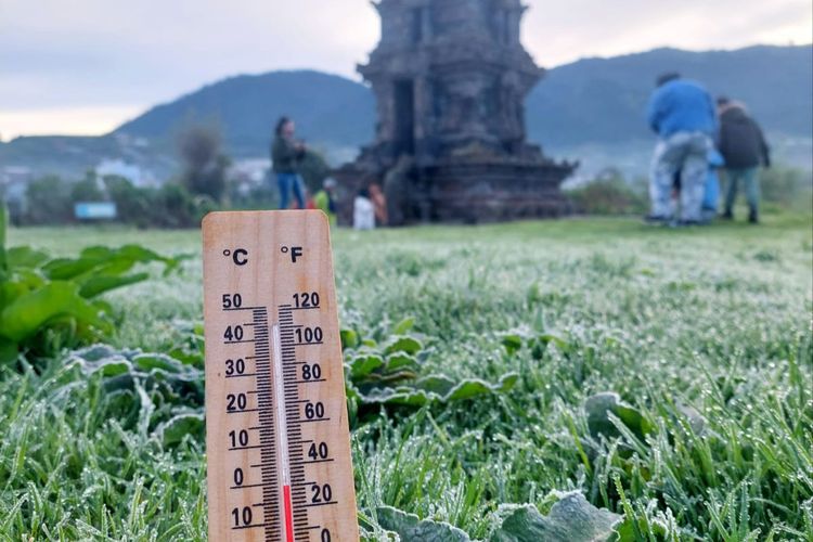 Bukan hanya kawasan TN Tengger Bromo Semeru, embun es juga muncul di taman wisata Dieng, Kabupten Banjarnegara, Jawa Tengah. Fenomena itu terjadi sejak Jumat (12/7/2024) lalu. Embun es bukan hanya di kompleks candi, tapi meluas hingga area permukiman warga.